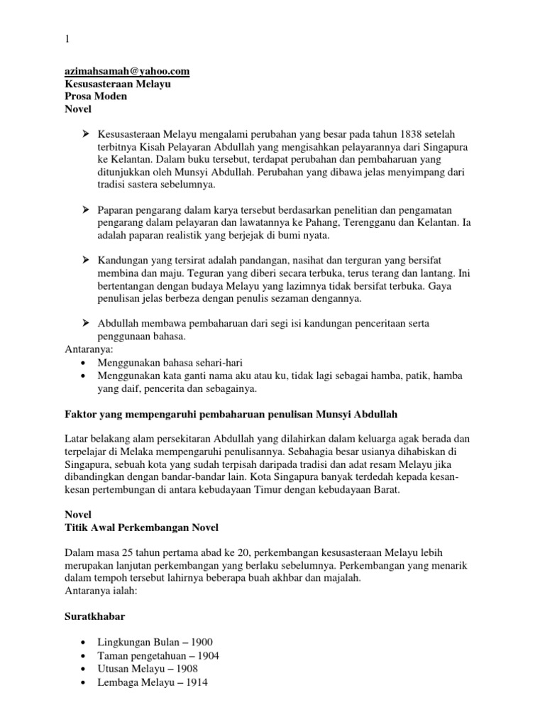 Secara kesimpulannya, tidak dapat dinafikan lagi bahawa abdullah munsyi merupakan bapa kesusasteraan melayu moden kerana beliau telah memisahkan kebiasaan sastera tradisional. Di bawah pengaruh dan didikan ayahnya abdul kadir, abdullah mulai belajar bahasa tamil, melayu dan arab. Datuk misbaha dalam pesaka, cetakan pertama 1983 hlm. Keturunan terengganu juga dapat dijumpai di negeri seberang pahang ( sekitar perkampungan di daerah kuantan (beserah, balok dan cherating), pekan dan rompin) dan johor (di daerah mersing) serta di kepulauan anambas dan natuna di. Soalan percubaan kesusasteraan melayu spm 2018 + skema jawapan.
